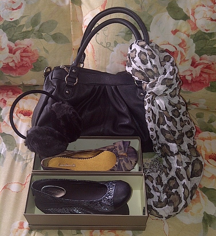 | Store Closing Sale at Costa X Clockwise from left: Black furry earmuffs, faux leather side satchel, leopard print scarf, midnight blue/black snake print flats, leopard print flats with bow detailing |